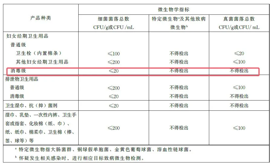 根據(jù)GB 15979—2024《一次性使用衛(wèi)生用品衛(wèi)生要求》,衛(wèi)生巾分為普通級(jí)和消毒級(jí)兩種。普通級(jí)衛(wèi)生巾的細(xì)菌菌落總數(shù)≤200CFU/g,真菌菌落總數(shù)≤100CFU/g,而消毒級(jí)衛(wèi)生巾的細(xì)菌菌落總數(shù)≤20CFU/g,真菌菌落不得檢出。